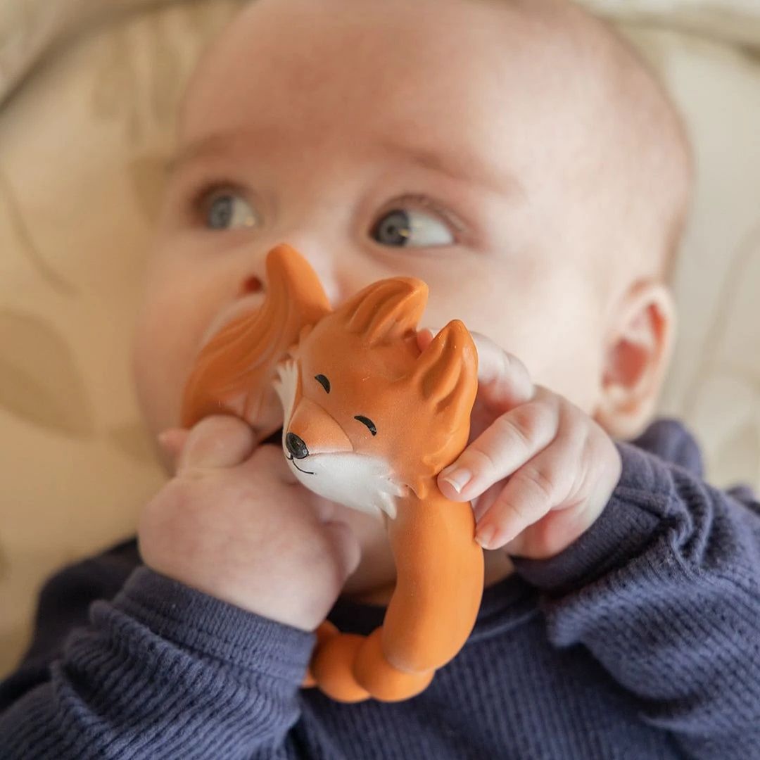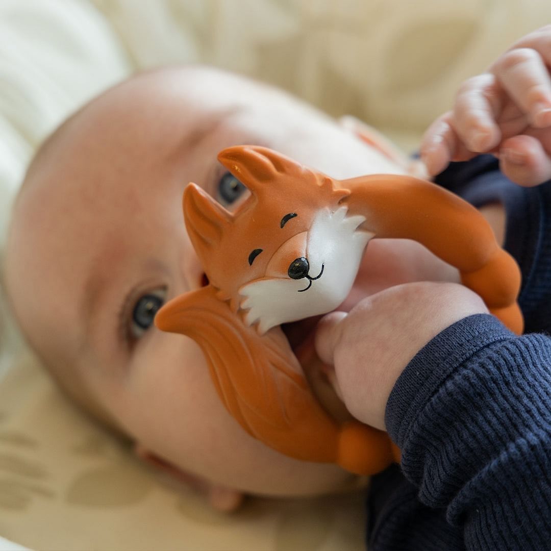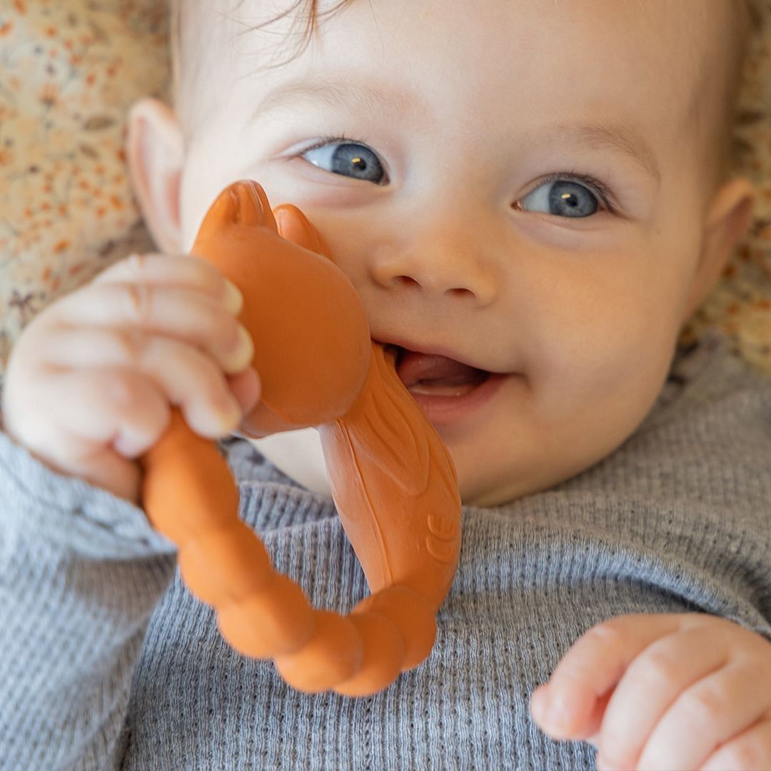 Este precioso anillo mordedor Zorro naranjo, de Natruba, está diseñado para ayudar con las molestias de la dentición al mismo tiempo que fomenta el juego sensorial y la entretención.